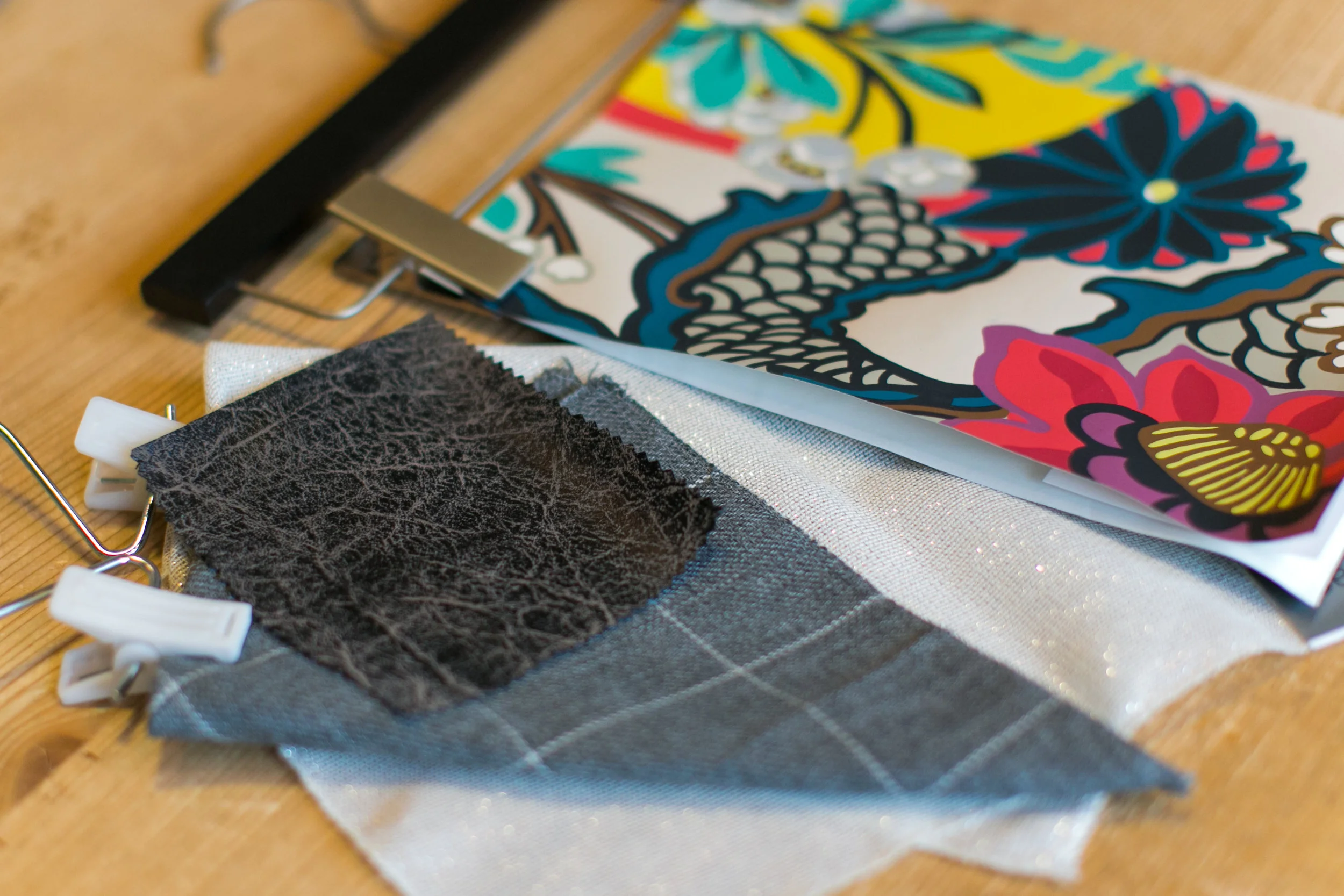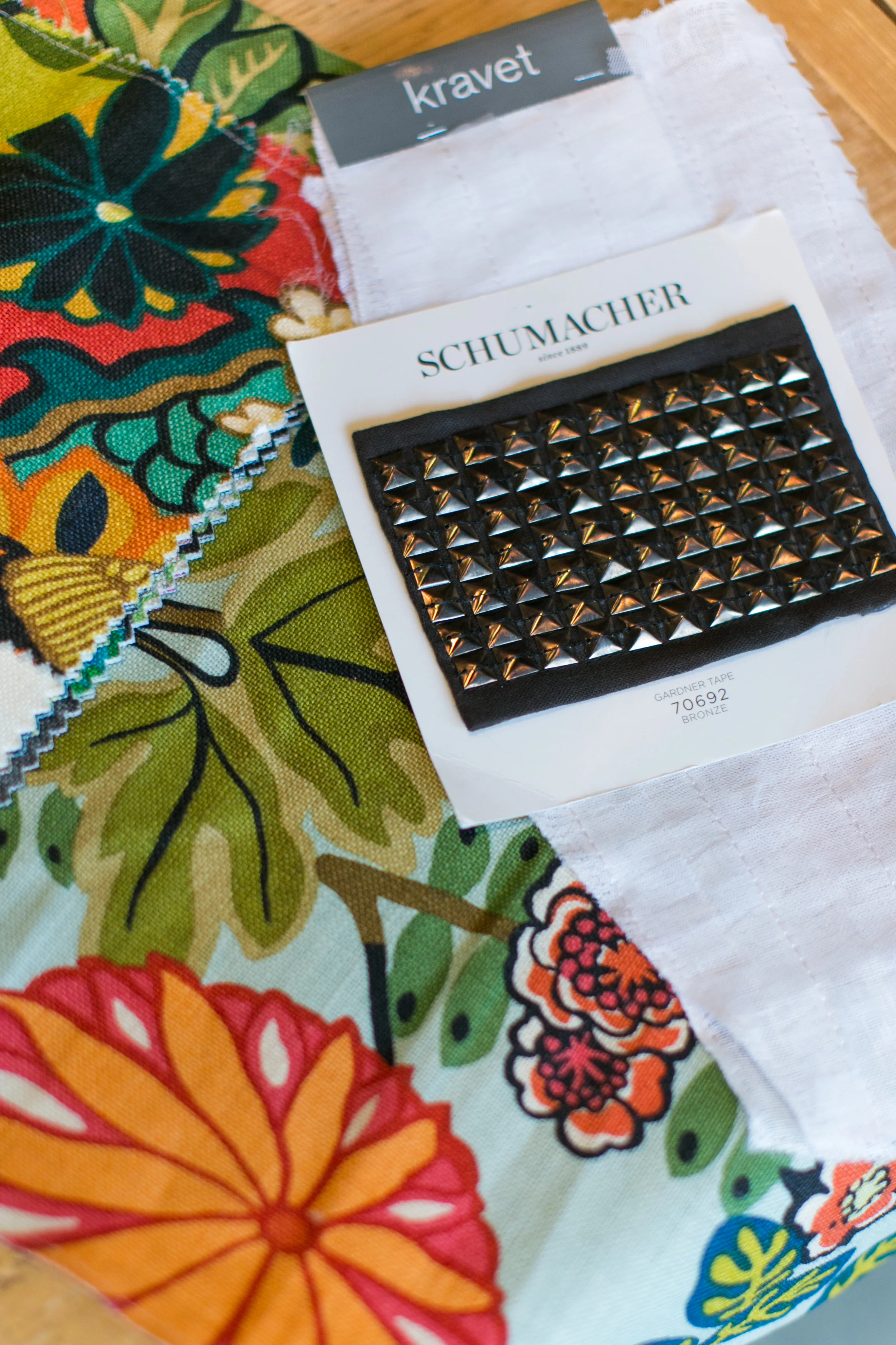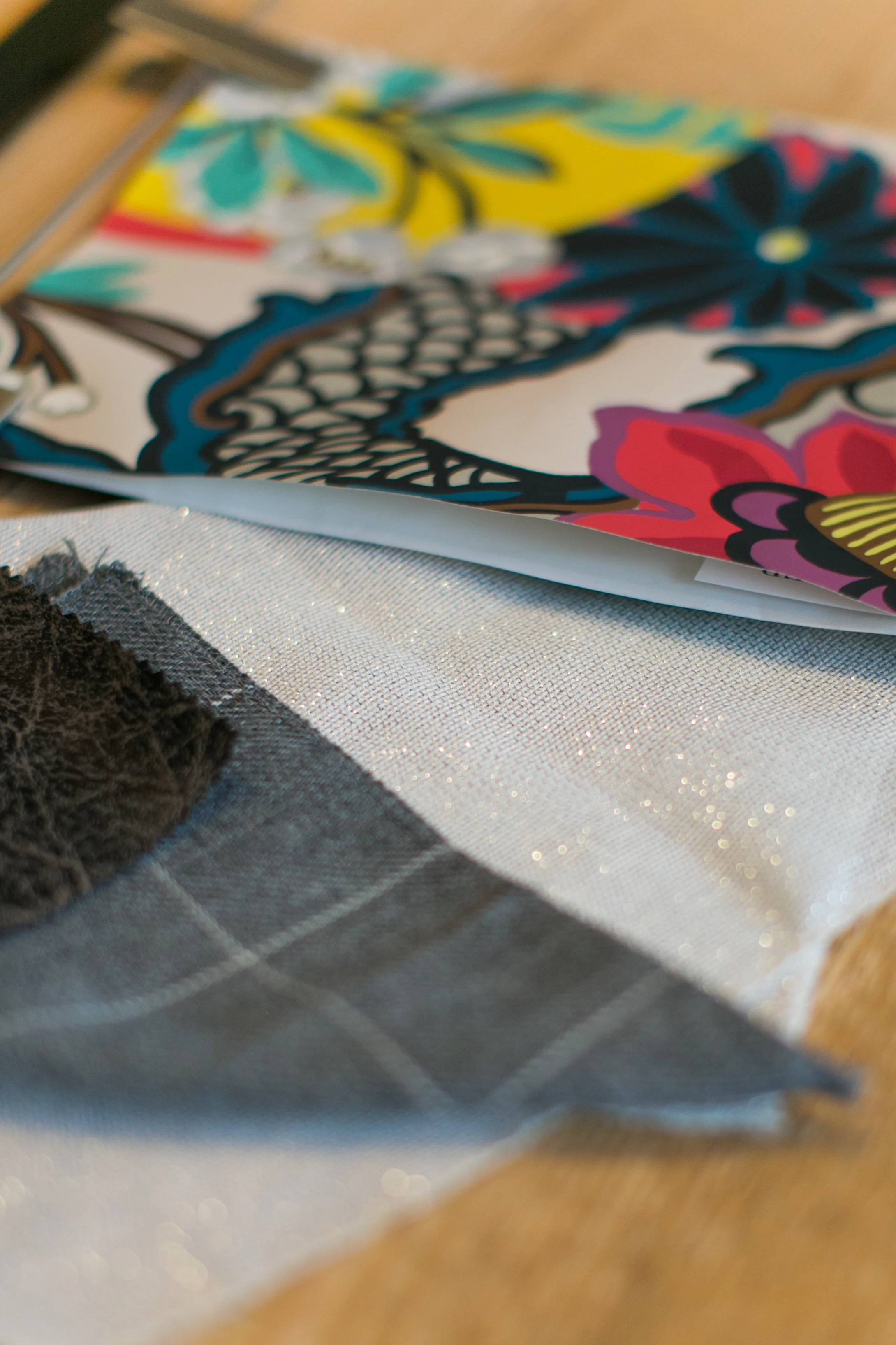 A good relationship is all about give and take, right? I gave my master bedroom this persona since this space in the home is equally shared by a couple. I wanted it to have both feminine and masculine attributes to it, as to not make one side feel uncomfortable in the room that should feel like a relaxing oasis. I was struck by the floral wallpaper, but what I specifically loved about it was the use of both feminine and masculine colors. It was the perfect focal point to set an even playing field. And then to pull in the hints of "his" side of the equation, I loved this deep, rich leather swatch paired with the grey suit pattern. And since I didn't want "his" influence in the master bedroom to "one-up" mine, I added in a second slightly feminine touch with this beautiful fabric that adds some shimmer and sparkle to the room when it catches the light just right.