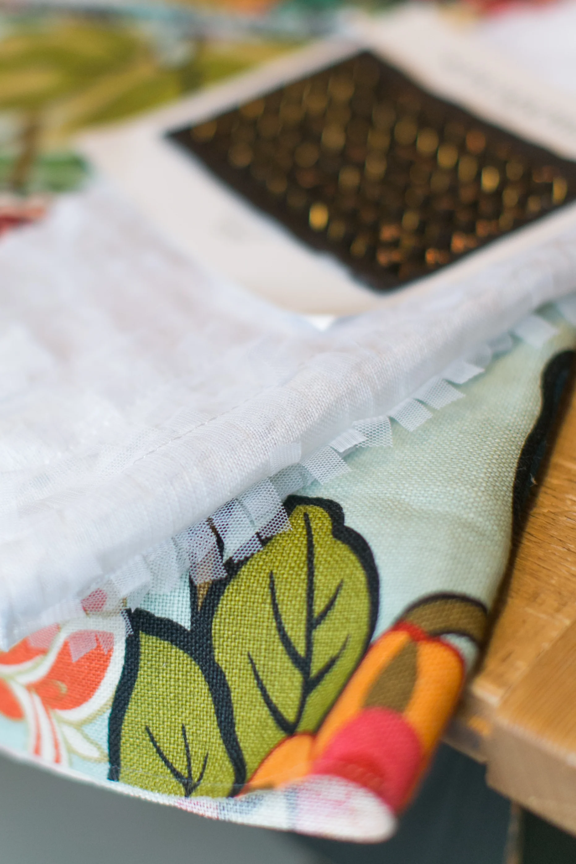 Please excuse my sense of humor for calling my make-believe kitchen "saucy!" What I mean by that is I wanted my kitchen to have a soft side to it, but at the same time have a bit of an attitude. This bold floral pattern (below) immediately caught my eye with its gorgeous color palette and graphics. Its sure to be the emphasis of any room that its placed in. And while I love the delicacy and the soft lines of the flowers, the tomboy in me added this bold bronze studded trim. And then to add a little dimension, I paired these two piece with this white sheer that offers a lot of movement with the tiny cuts of fabric.