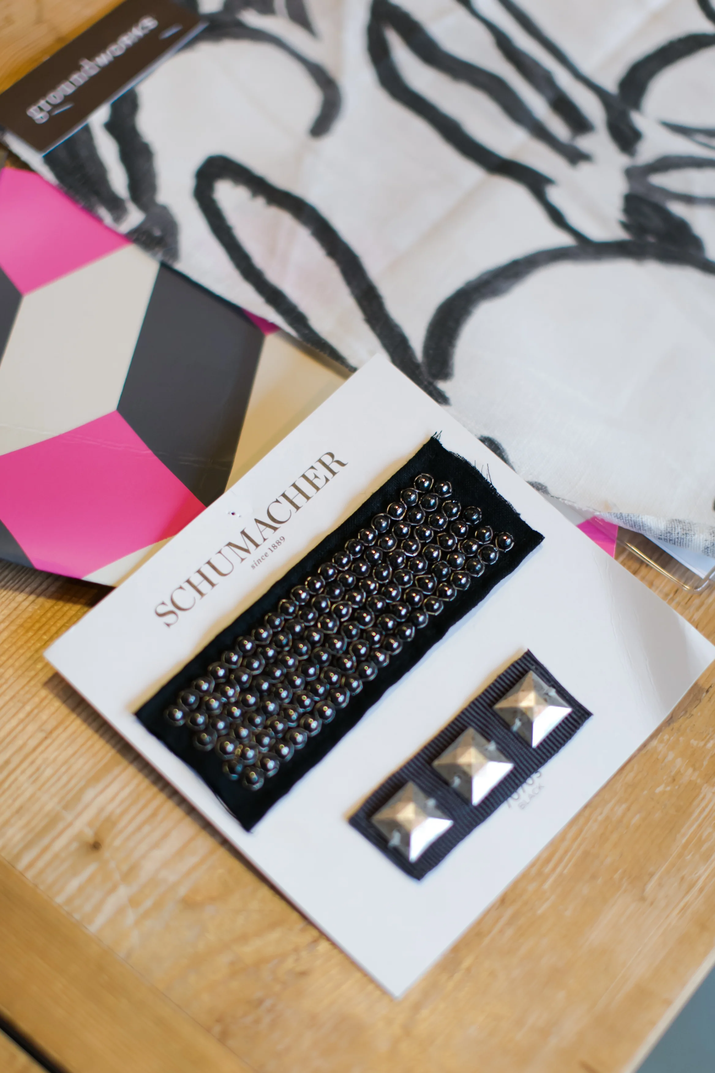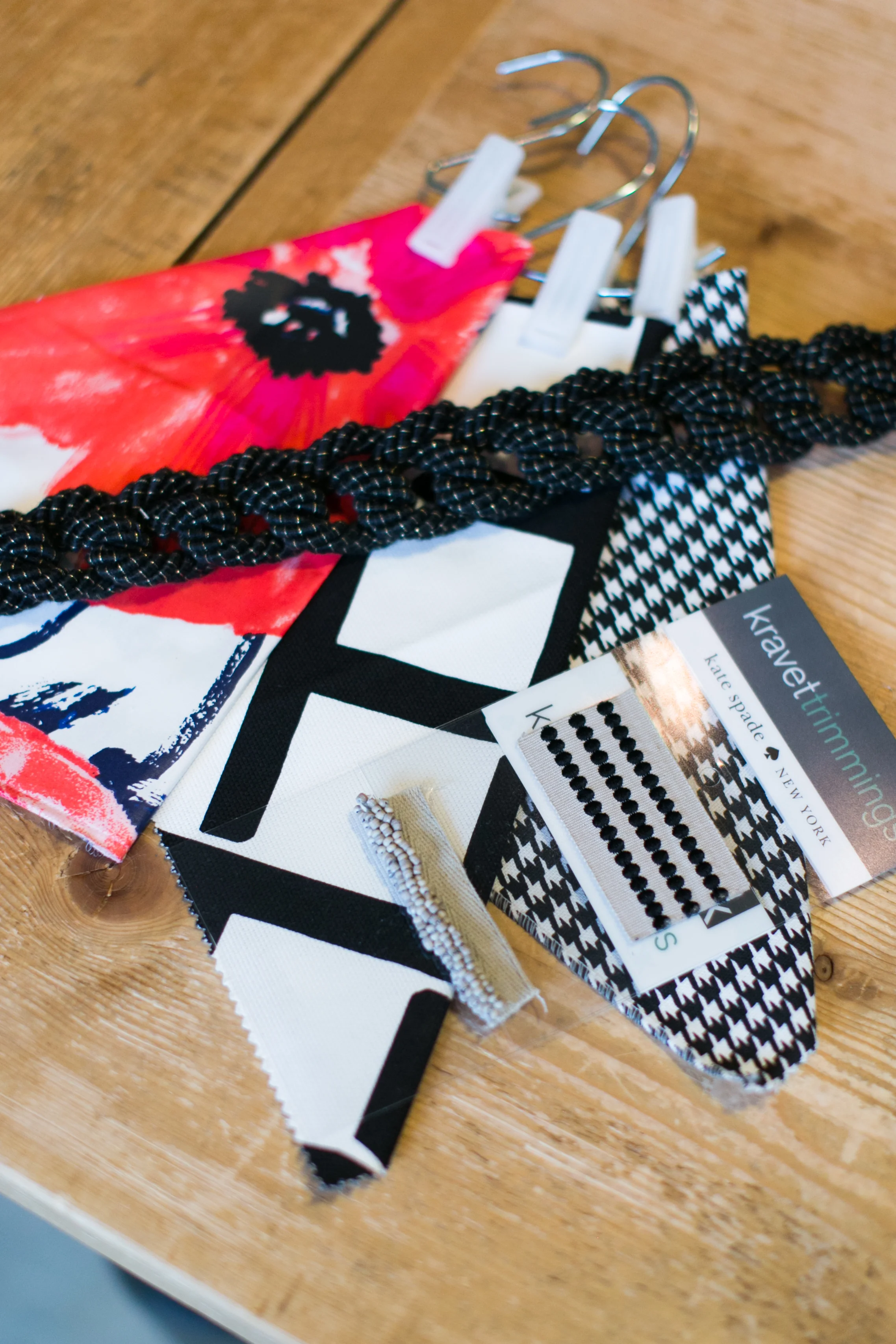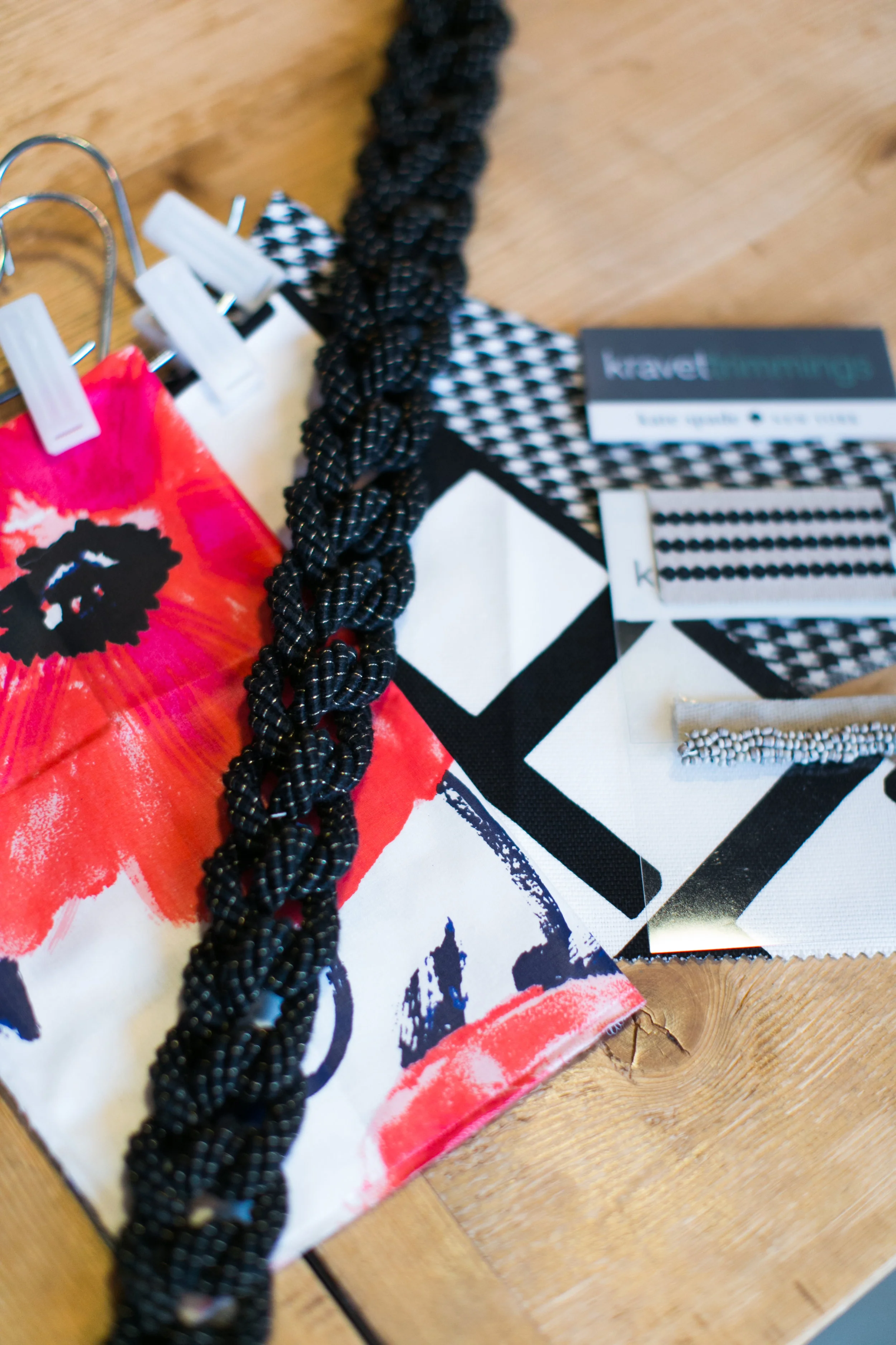 Lets face it...I work from home, and my husband has an "office job," so that means I get to put a girly touch on this space. No one starts his or her own business being timid, so this room had to be designed with some confidence! I couldn't think of a better, bolder option, than this poppy flower pattern! To me, this looks more like artwork than just a fabric. Not being shy, I wanted to add two more black and white patterns, drastically fluctuating in size to show my level of confidence. Since they are all two-dimensional though, I thought the braided black trim paired with a beaded trim and a polka dot accent gave the room the depth it needed.